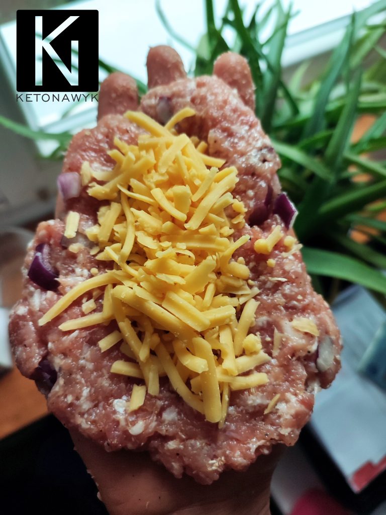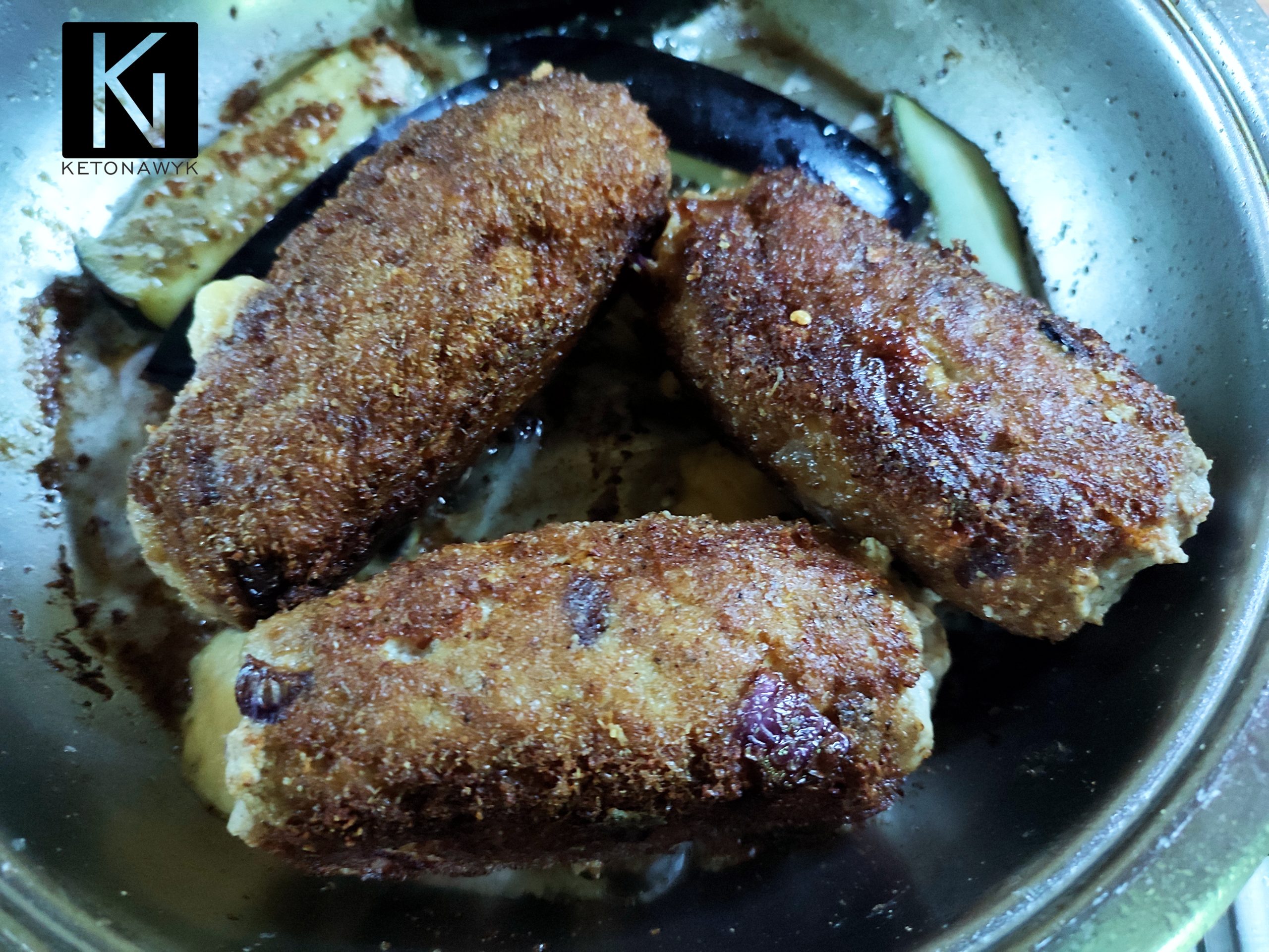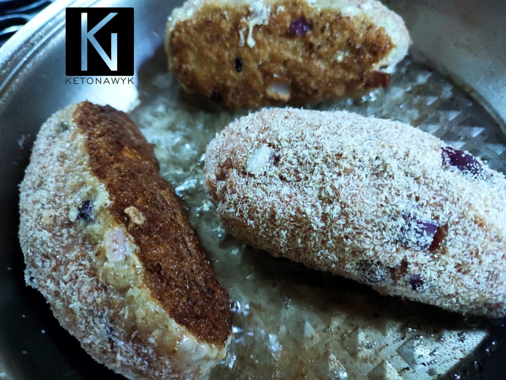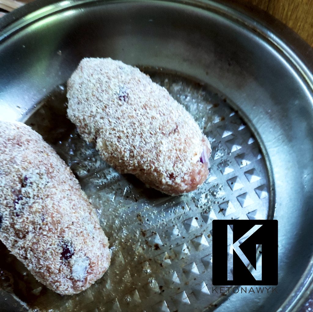 Ketogeniczne Roladki wieprzowe z mięsa mielonego (łopatka) w chrupiącej panierce z łuski babki jajowatej nadziewane żółtym serem.