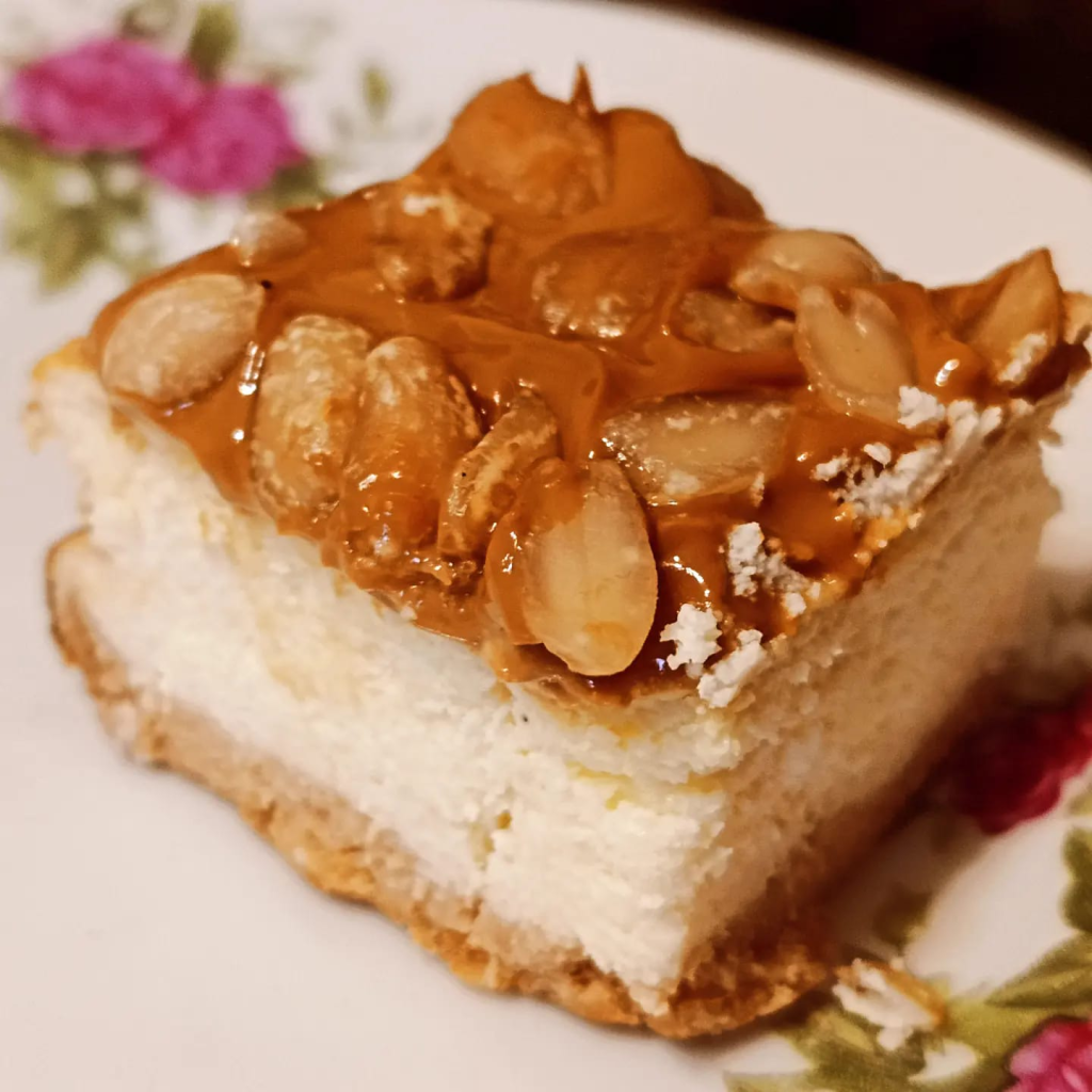 Na schłodzony sernik wyłożyć masę kajmakową bez cukru, na górę posypać orzechamiarachidowymi – prażonymi, solonymi.