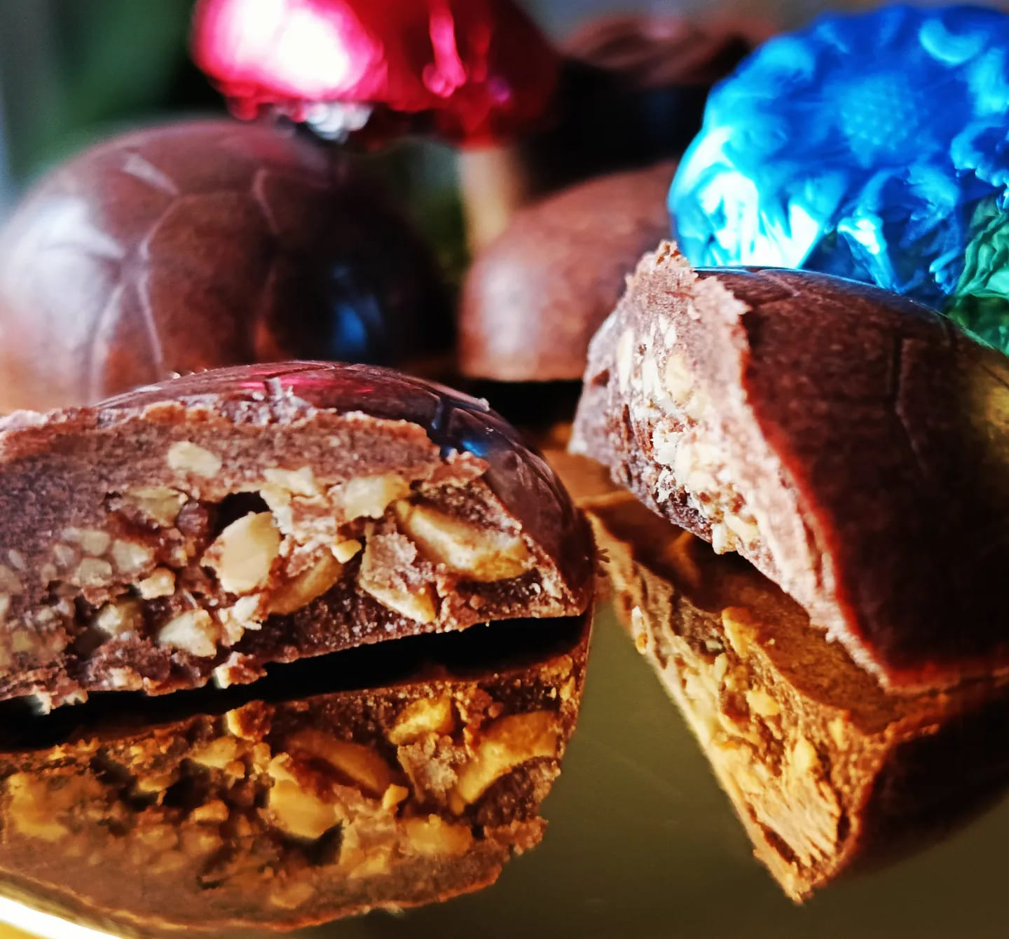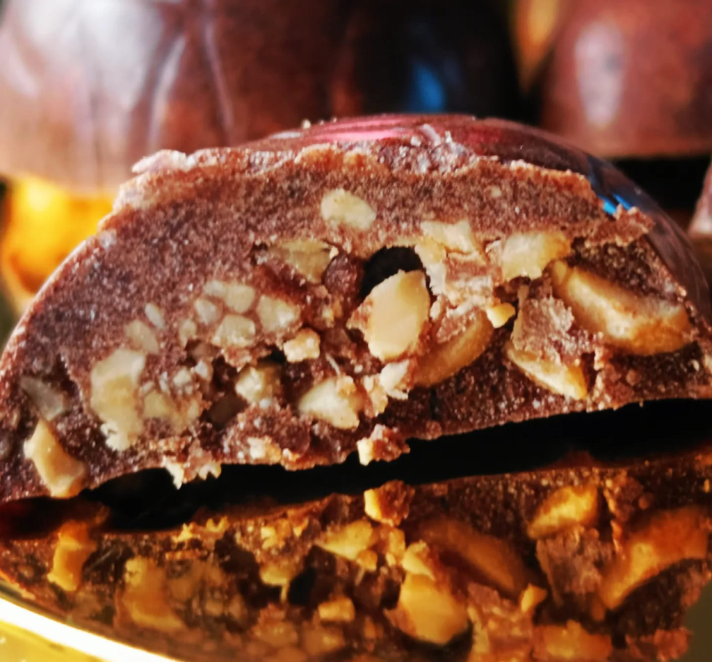 Żeby mieć wzór z foremek – pierwsza warstwę najlepiej zrobić z samej czekolady, na chwilę do zamrażarki i nakładać czekoladę z orzechami.