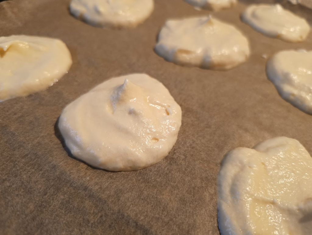 Nakładać łyżeczką na blachę wyłożoną papierem do pieczenia niewielkie porcje, można delikatnie spłaszczać i formować okrągłe biszkopciki.