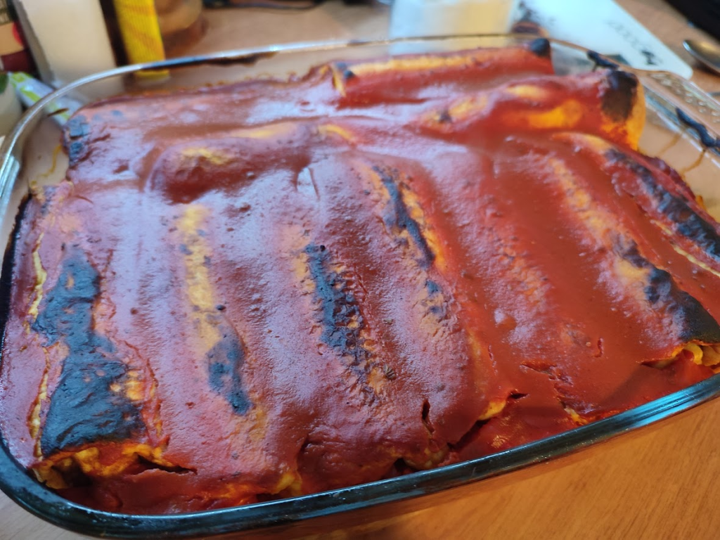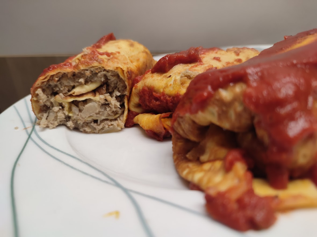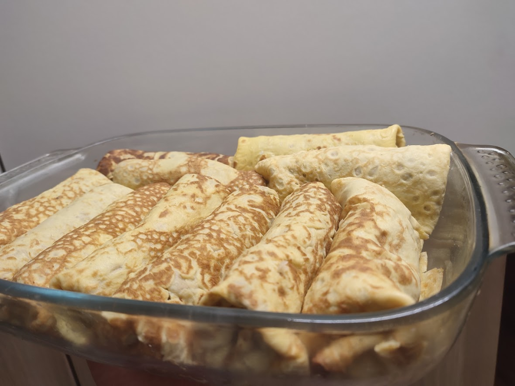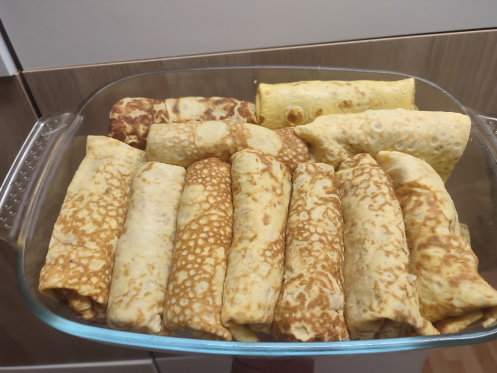 Nakładamy farsz na naleśniki, zawijamy jak krokiety, układamy w naczyniu żaroodpornym. Polewany sosem. Wkładamy do piekarnika nagrzanego na 180 stopni i pilnujemy – mi się trochę przypiekły od góry 😆.