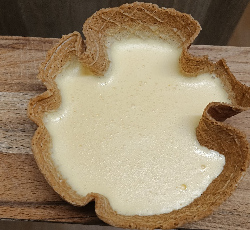 Ja upieczony wafelek nakładam na miseczkę, dociskam ręką by zrobić wgłębienie i zostawiam do wystudzenia.