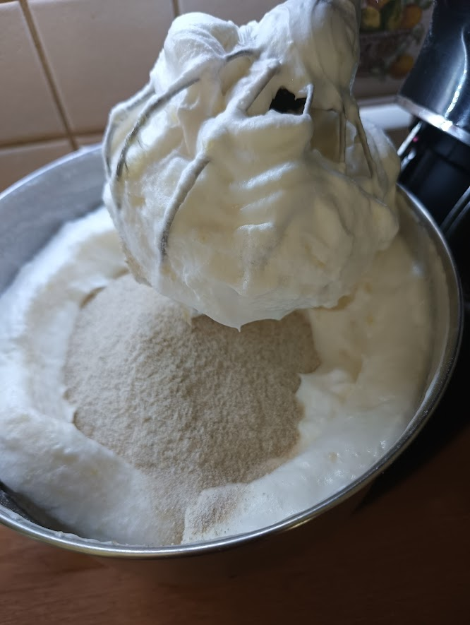 Białka ubić wraz z gumą guar, solą, sodą oraz octem na gęstą puszystą pianę.