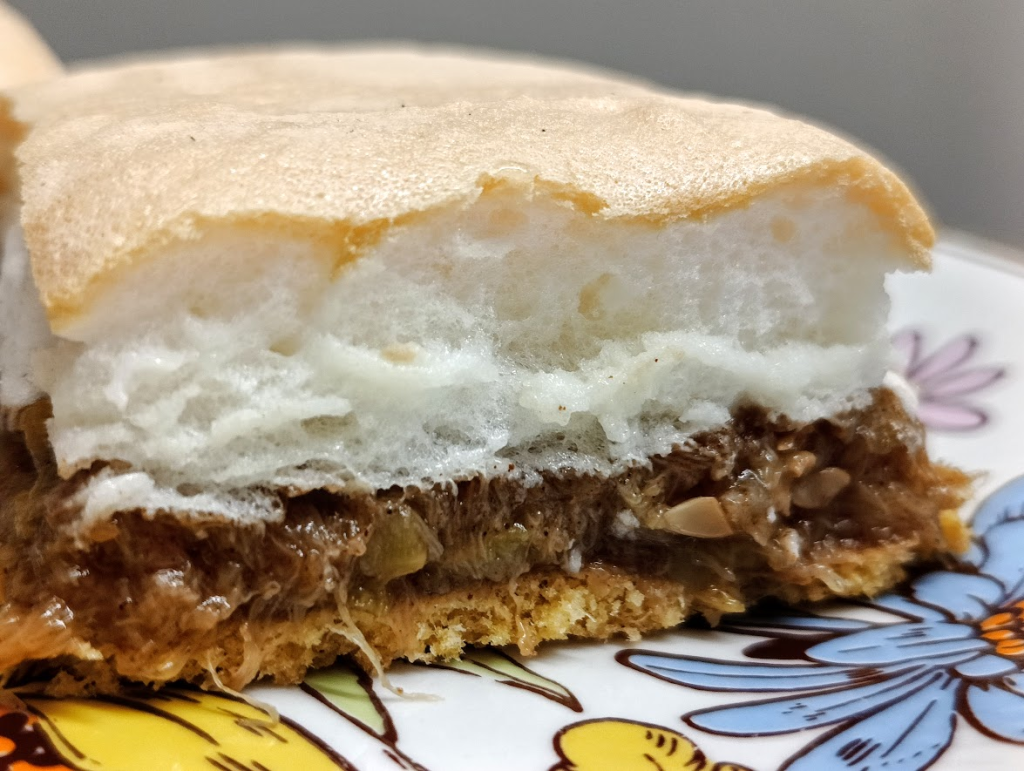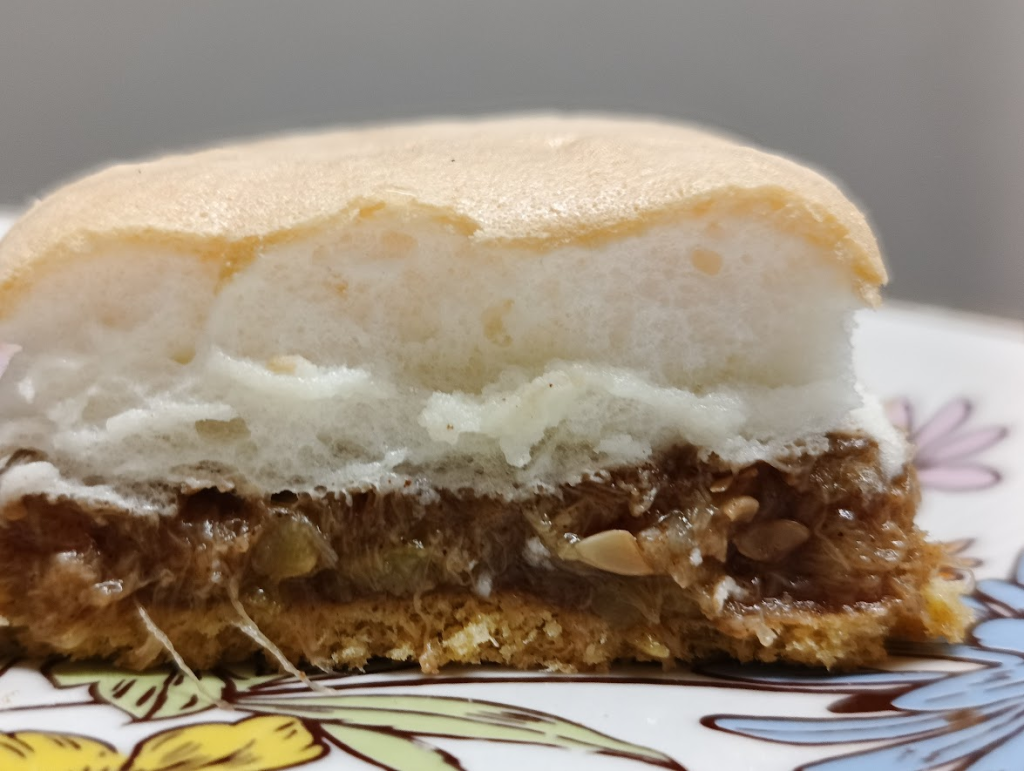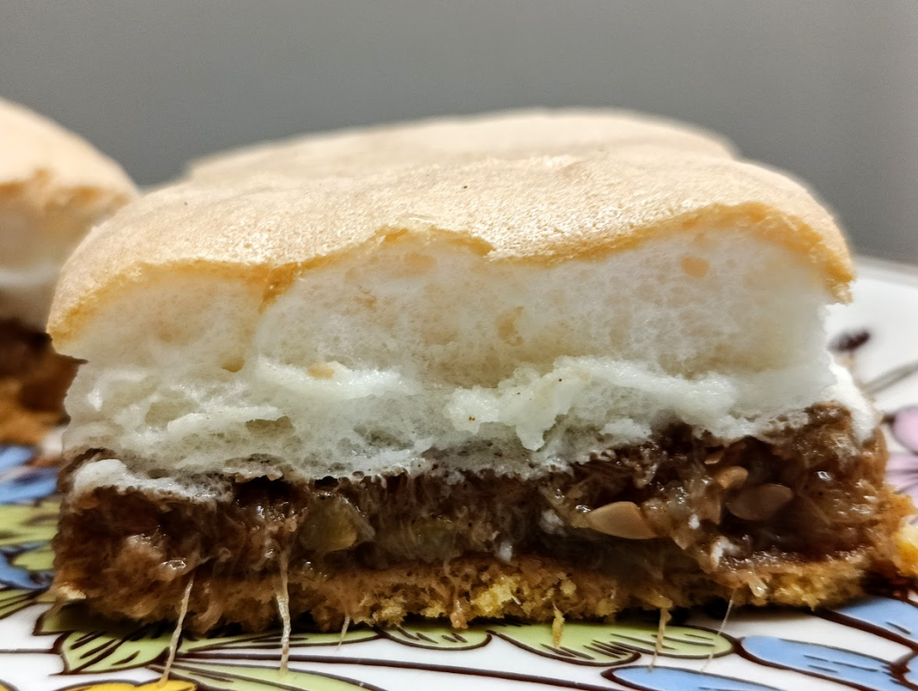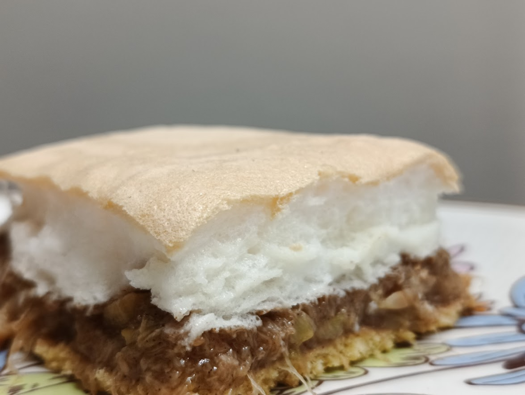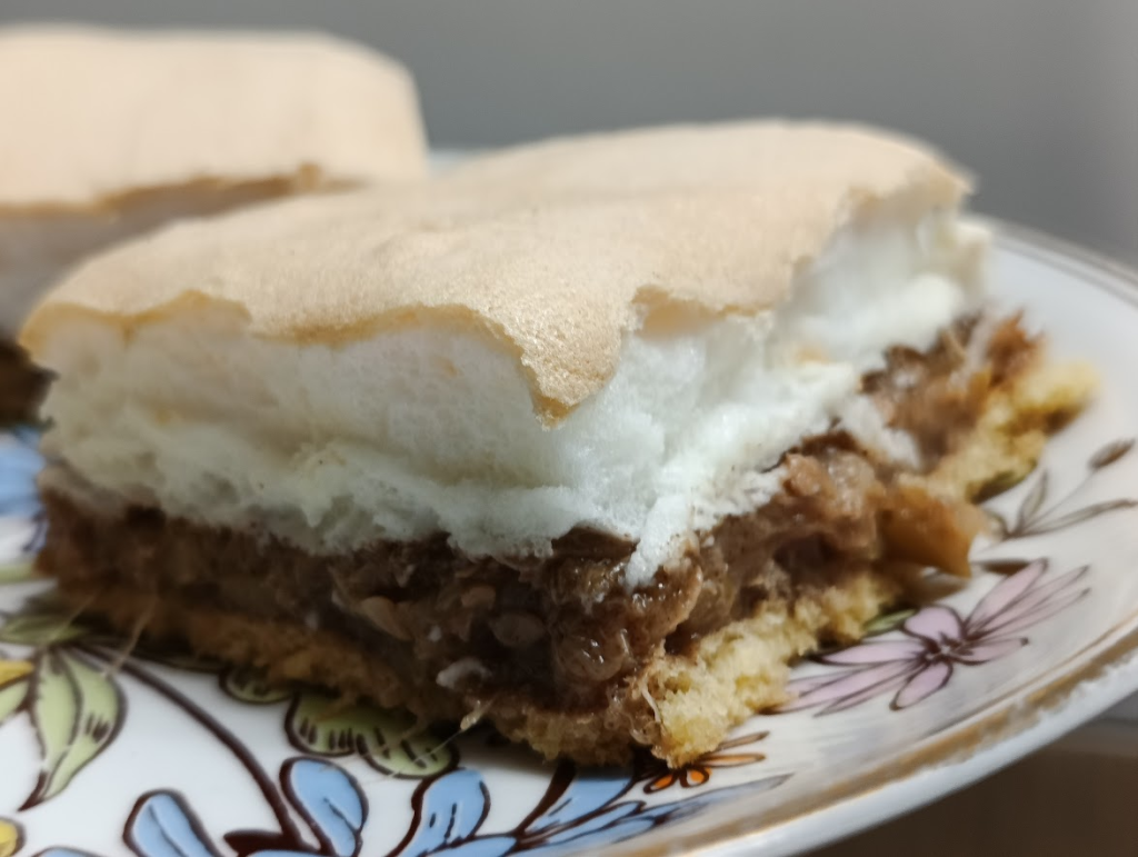 Na gorący spód wyłożyć mus z cukinii, na górę bezę.