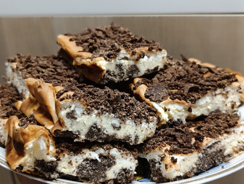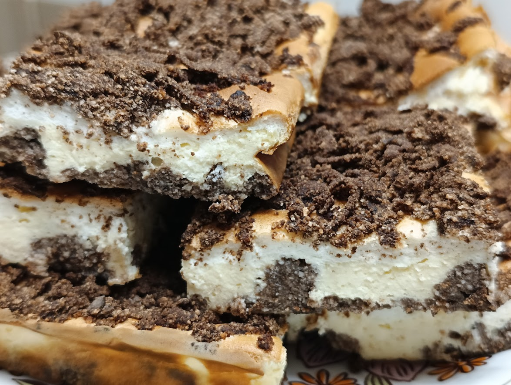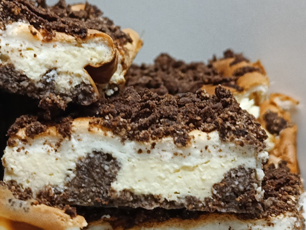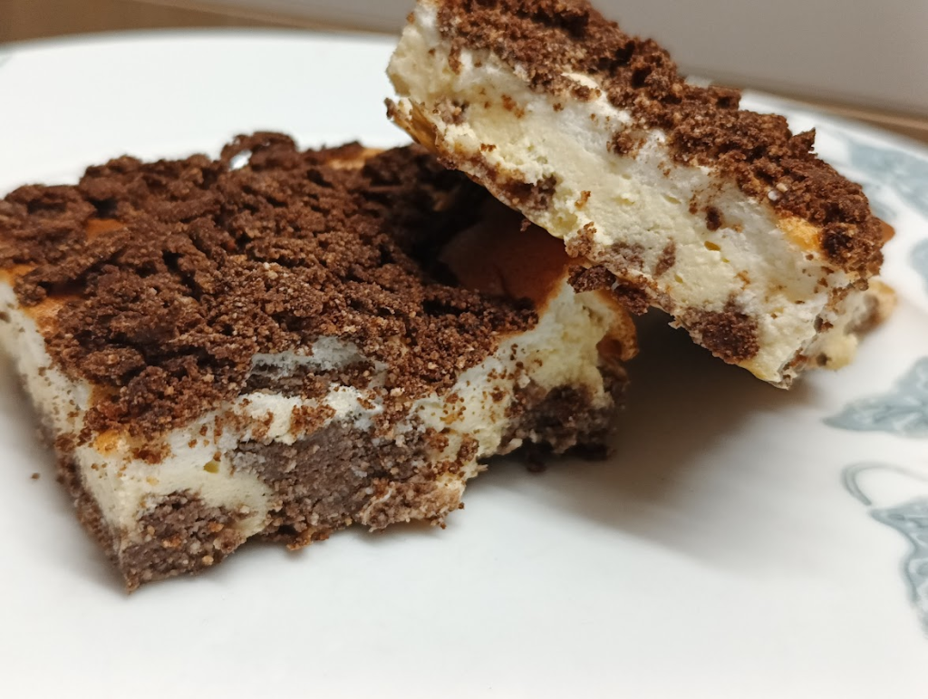 Sernik z pianką w kakaowej kruszonce. Sernik składa się z 4 warstw. Od spodu jest kakaowa kruszonka- która podczas pieczenia delikatnie miesza się z kolejną warstwą, później warstwa sernikowa z żółtkami a następnie delikatna pianka sernikowa z białek, na górze znowu kakaowa kruszonka. Przepis na ciasto jest prosty, pyszny i efektowany. Ciasto upiekłam na dużej formie o wymiarach 36 cm x 29 cm – jeśli chcecie wyższe użyjcie mniejszej blaszki. Zdecydowałam się na użycie skrobi ziemniaczanej zamiast budyniu, dla pewniejszego wyliczenia makro.