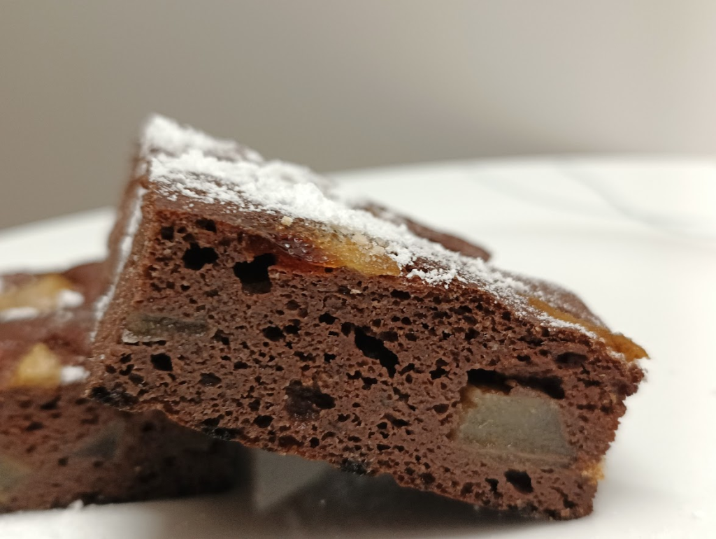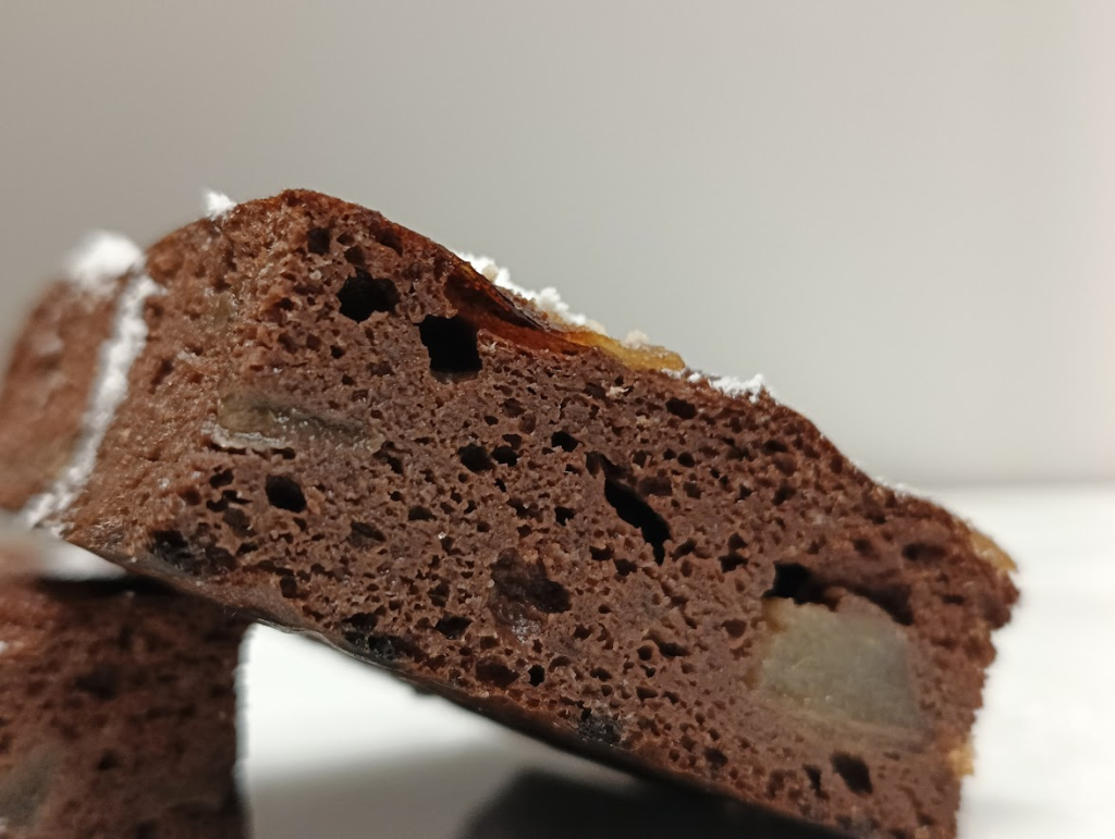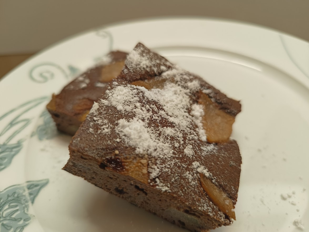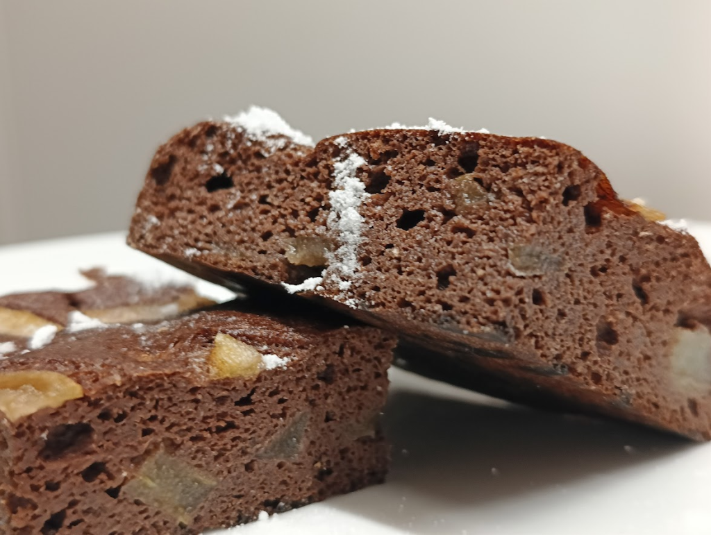 Keto kakaowe mokre ciasto z gruszkami. Ciasto dobrze się wypieka i wyrasta, pozostając mokrym i wilgotnym.
