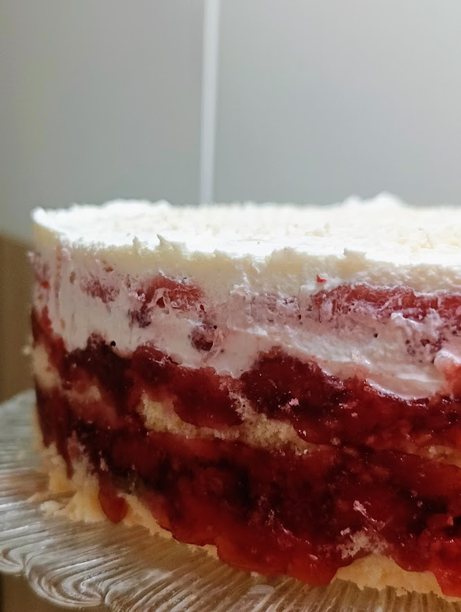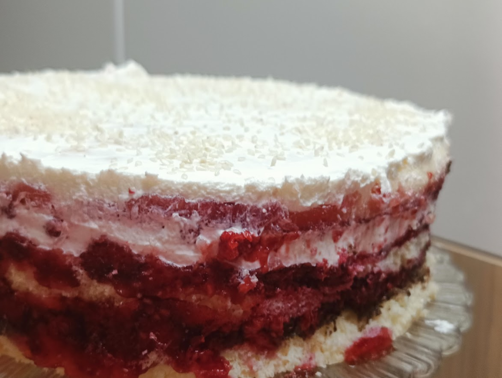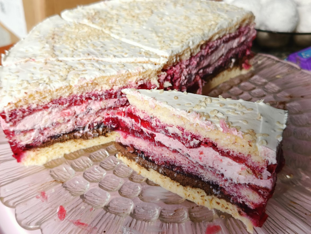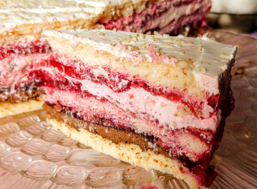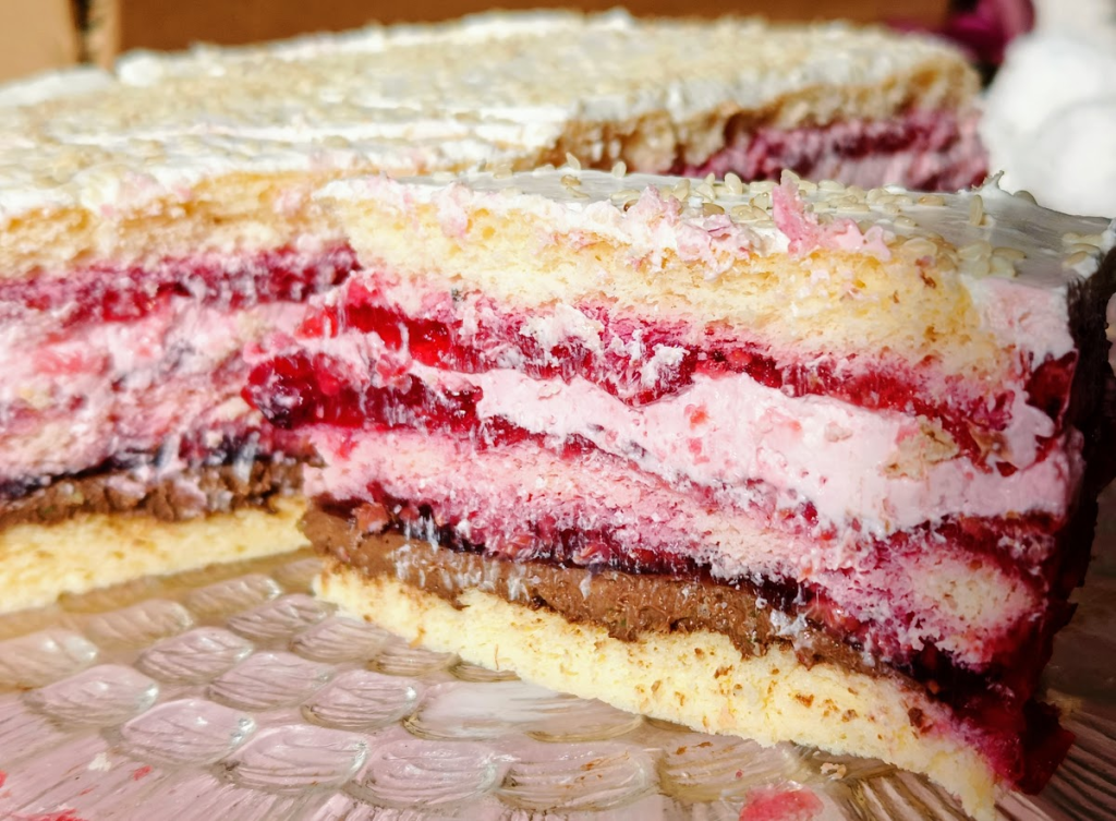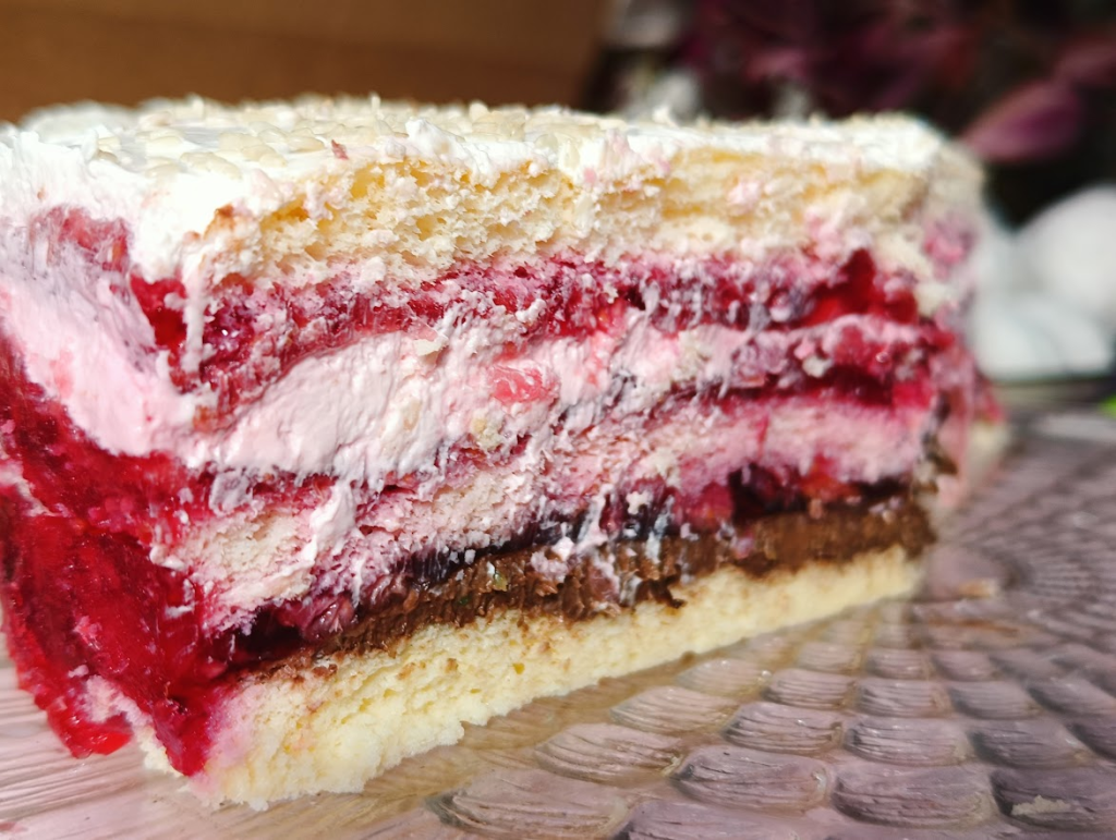 1 blat, krem nugatowy, 1/3 galaretki malinowej