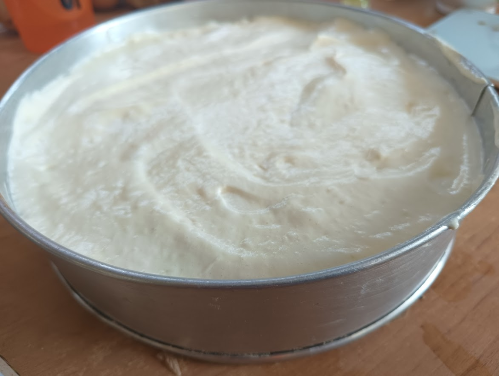 - Przełóż masę do tortownicy (26 cm) wyłożonej papierem do pieczenia.