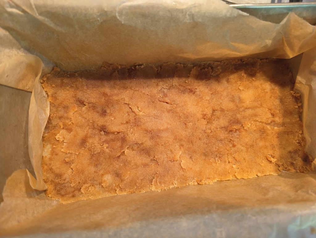 - Przełóż do formy 16 × 29 cm. Uformuj spód (np. łyżką). Wstaw do lodówki.