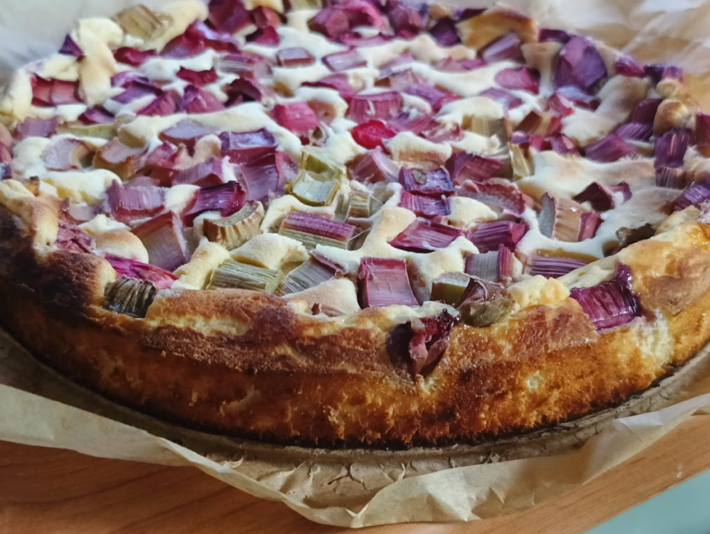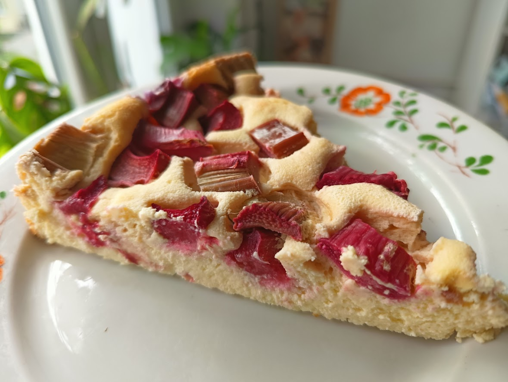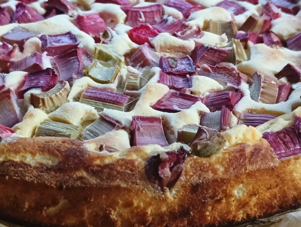 - Na wierzchu rozłóż pokrojony rabarbar, posyp 2–3 łyżkami erytrytolu.