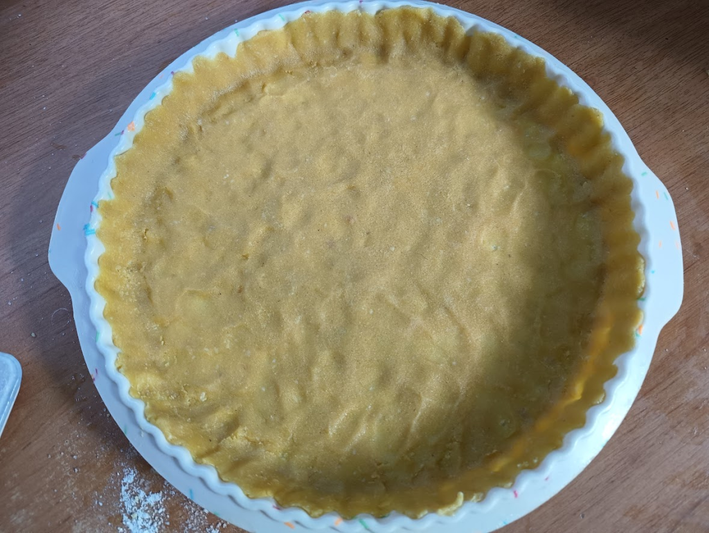 - Foremkę do tarty o średnicy 25 cm wyłożyć ciastem – najlepiej przy pomocy zwilżonych dłoni, aby masa nie przyklejała się do palców.