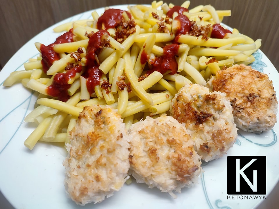 Mielone z filetu z kurczaka z serem w panierce kokosowej. Podane z fasolką szparagową i domowym ekspresowym ketchupem.