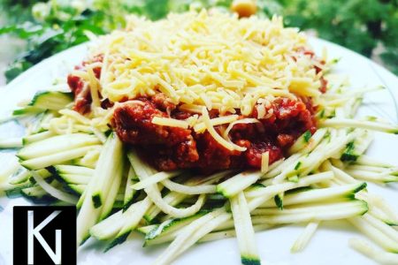 Makaron z cukinii i makaronu konjac w sosie z żółtek i mascarpone . Składniki na 1 porcję :